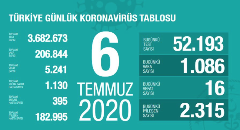 İlk günden bu yana testi pozitif çıkanların sayısı, bugün tespit edilen bin 86 yeni vakayla birlikte 206 bin 844’e yükselirken, virüs nedeniyle yoğun bakımda yatanların sayısı da bin 130 olarak ifade edildi.