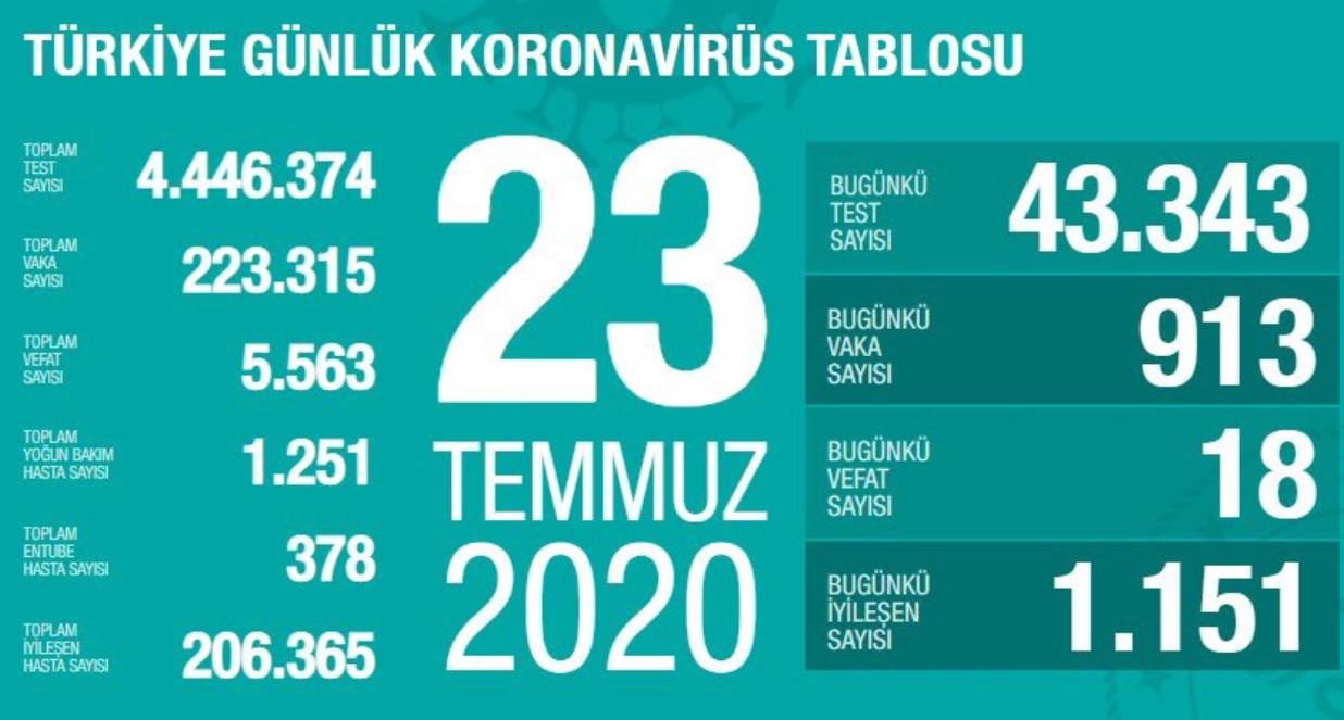 Sağlık Bakanı Fahrettin Koca, Türkiye’de koronavirüs (Kovid-19) nedeniyle 18 kişinin daha hayatını kaybettiğini, 913 yeni vaka tespit edildiğini açıkladı. Böylece koronavirüsten yaşamını yitirenlerin sayısı 5 bin 563’e, vaka sayısı ise 223 bin 315’e yükseldi.