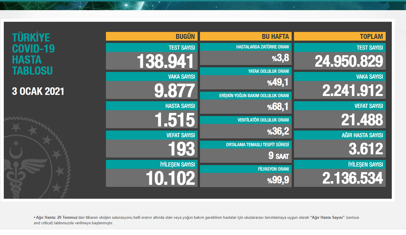 Koronavirüs salgını günlük verilerini paylaşan Sağlık Bakanlığı’na göre son 24 saatte 138 bin 941 test yapıldı, 9 bin 877 vaka tespit edildi. Bakanlık ağır hasta sayısını 3 bin 612, hasta sayısını bin 515 olarak açıklarken, yaşamını yitirenlerin sayısı 193 oldu.