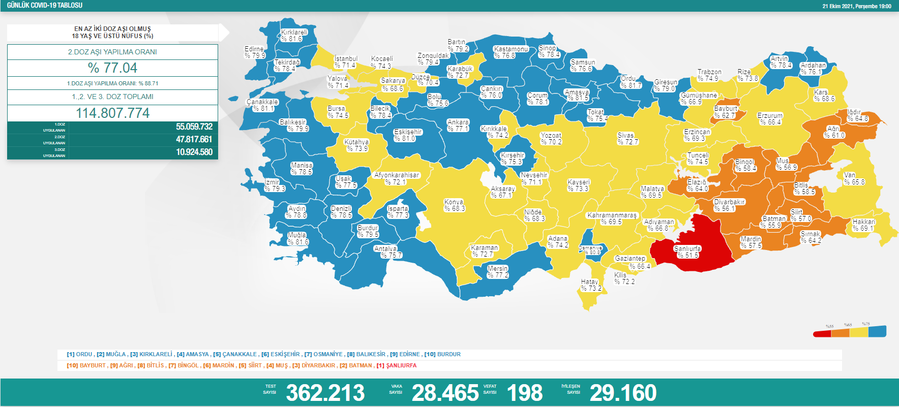 Sağlık Bakanlığı’nın günlük açıkladığı koronavirüs verilere göre son 24 saatte 362 bin 213 test yapıldı ve 28 bin 465 yeni vaka tespit edildi. 198 kişinin koronavirüs sebebiyle hayatını kaybettiği belirtilirken, 29 bin 160 kişi de iyileşti.