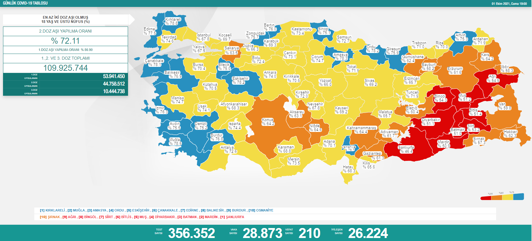 Sağlık Bakanı Fahrettin Koca, koronavirüs vefat ve vaka sayısını sanal medya hesabından şu paylaşımda bulundu: “Yeni vaka sayımız 28.873. Can kaybımız 210. Tedbirleri toplum olarak birlikte ve düzenli şekilde uygulamadığımız gerçeğiyle karşı karşıyayız. Yer yer küçük düşüşler oluyor ama bu düşüşler istikrar göstermiyor. Sonbahar şartlarında daha dikkatli olmalı, aşılarımızı yaptırmalıyız.”