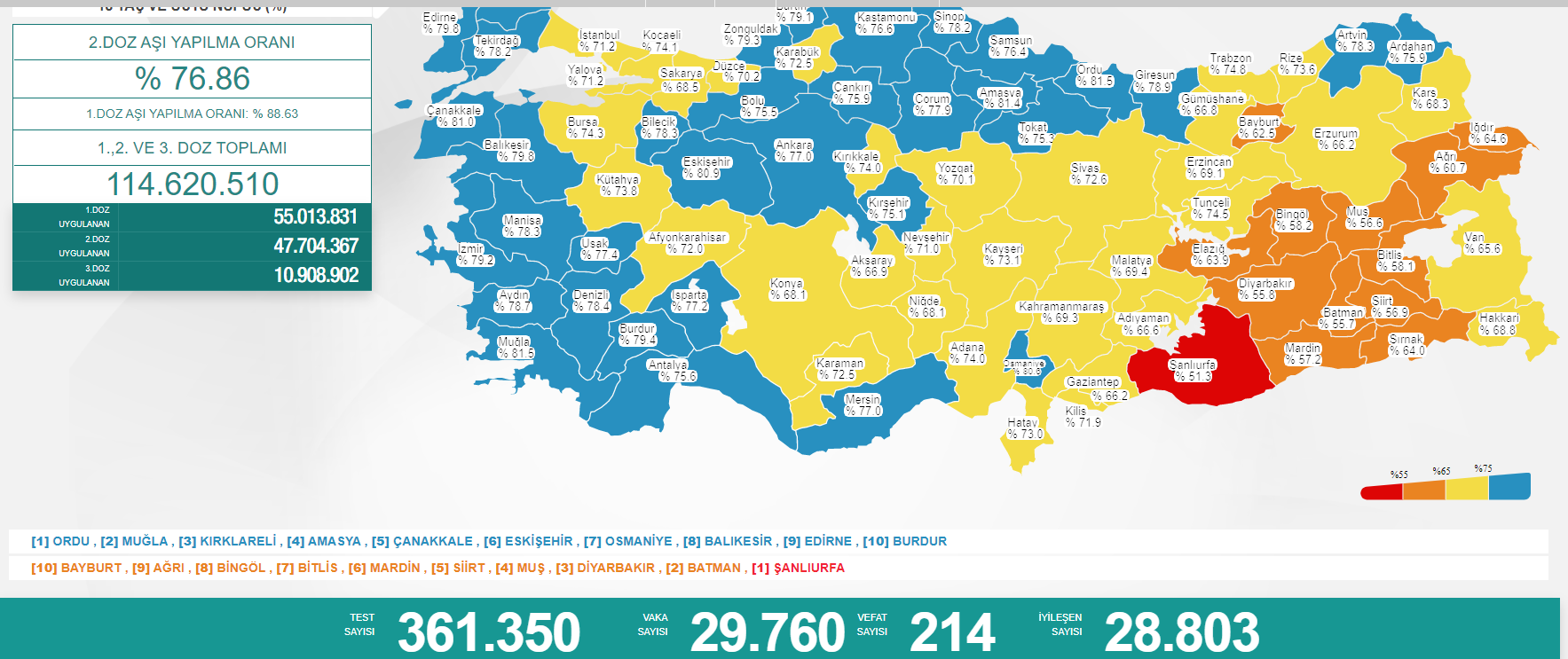 Sağlık Bakanlığı’nın günlük açıkladığı koronavirüs verilere göre son 24 saatte 361 bin 350 test yapıldı ve 29 bin 240 yeni vaka tespit edildi. 214 kişinin koronavirüs sebebiyle hayatını kaybettiği belirtilirken, 28 bin 803 kişi de iyileşti.