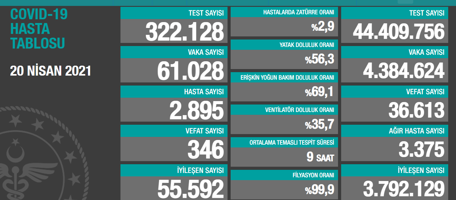 Ağır hasta 3 bin 375 olurken, 55 bin 592 kişinin Covid-19 tedavisinin/karantinasının sona ermesiyle iyileşen sayısı 3 milyon 792 bin 129’a yükseldi.