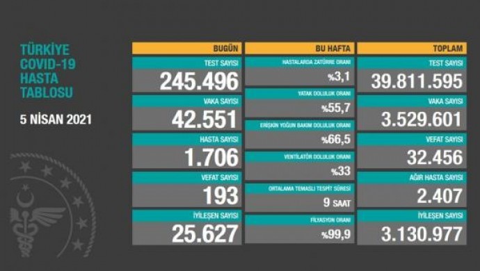 Sağlık Bakanlığı, koronavirüs (Covid-19) günlük hasta tablosunu paylaştı. Verilere göre, Türkiye’de koronavirüs nedeniyle son 24 saatte 193 kişi daha hayatını kaybetti, bin 706 yeni hasta dahil olmak üzere 42 bin 551 yeni vaka tespit edildi.