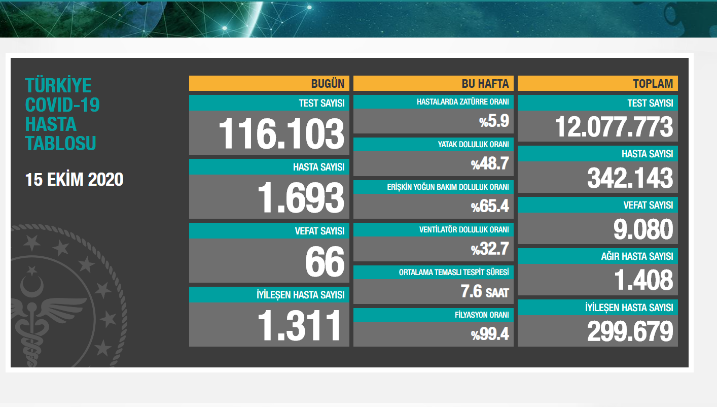 Tabloya göre Türkiye’de koronavirüs nedeniyle 66 kişi daha hayatını kaybetti, bin 693 yeni hasta tespit edildi. Böylece toplam vefat sayısı 9 bin 80’e, hasta sayısı ise 342 bin 143’e yükseldi. 116 bin 103 test yapılırken, test sayısı 12 milyonu geçti. Bugün bin 311 hasta iyileşirken, toplam iyileşen sayısı 300 bine yaklaştı.