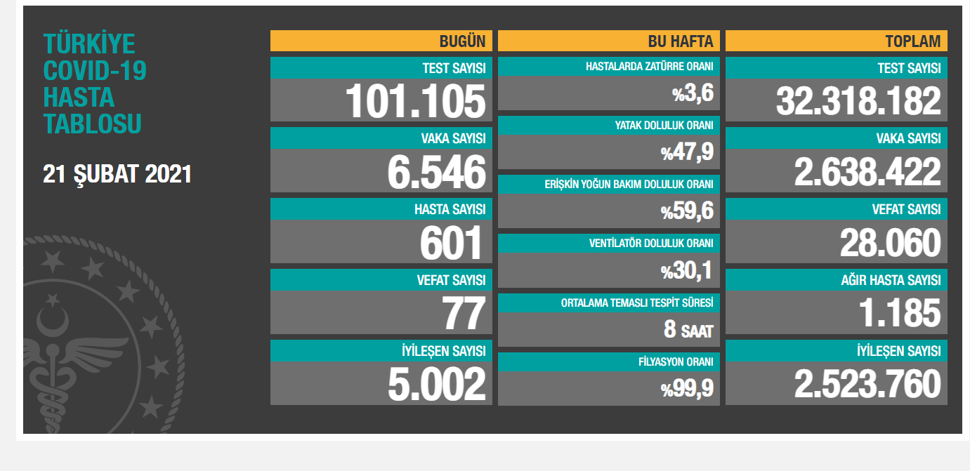Koronavirüs nedeniyle 77 kişi daha hayatını kaybetti, 6 bin 546 yeni vaka tespit edildi. Bugünkü test sayısı 101 bin 105, ağır hasta sayısı bin 185 olarak açıklanırken, bugüne kadar pandemiden dolayı yaşamını yitiren toplam kişi sayısı 28 bin 60’a, vaka sayısı ise 2 milyon 638 bin 422’ye yükseldi.