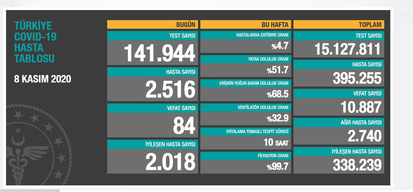 Türkiye’de koronavirüsten hayatını kaybedenlerin sayısı 84 kişi daha artarak 10 bin 887’e yükselirken, ‘hasta’ sayısı da 395 bin 255’e ulaştı. Ağır hasta sayısı 2bin 740 olurken, 2 bin 18 kişi de iyileştiği açıklandı. Türk Tabipler Birliği (TTB) ve uzmanlar sayıların ifade edilenden daha fazla olduğunu vurguluyor.