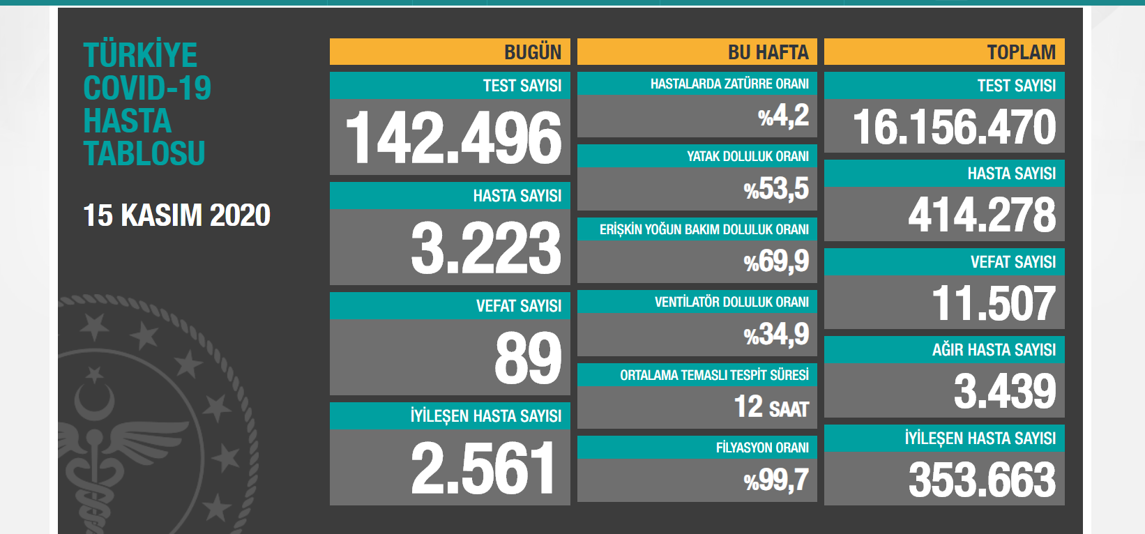 Türkiye’de koronavirüs nedeniyle son 24 saatte 89 kişi yaşamını yitirdi, 3 bin 223 yeni hasta tespit edildi. Virüs nedeniyle hayatını kaybedenlerin toplam sayısı 11 bin 507’ye, toplam hasta sayısı 414 bin 5278’ye yükseldi. Bugünkü iyileşen hasta sayısı 2 bin 561 olurken, toplam iyileşen hasta sayısı 353 bin 663’e ulaştı. Hastalarda zatürre oranı yüzde 4.2 olarak açıklanırken, ağır hasta sayısı 3 bin 439’a yükseldi.