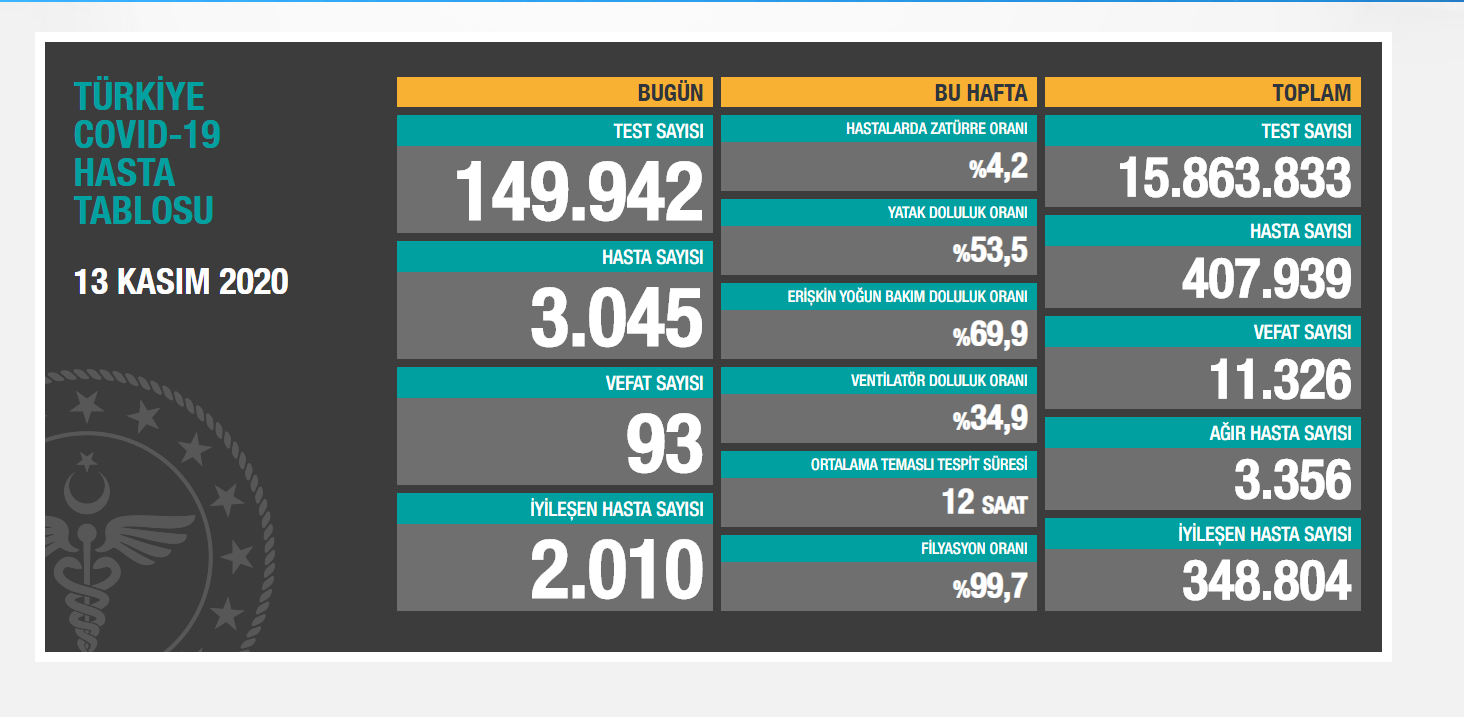 Türkiye’de koronavirüs nedeniyle son 24 saatte 93 kişi yaşamını yitirdi, 3 bin 45 yeni hasta tespit edildi. Virüs nedeniyle hayatını kaybedenlerin toplam sayısı 11 bin 326’ya, toplam hasta sayısı 407 bin 939’a yükseldi. Bugünkü iyileşen hasta sayısı 2 bin 10 olurken, toplam iyileşen hasta sayısı 348 bin 804’e ulaştı. Hastalarda zatürre oranı yüzde 4.2 olarak açıklanırken, ağır hasta sayısı 3 bin 356’ya yükseldi.