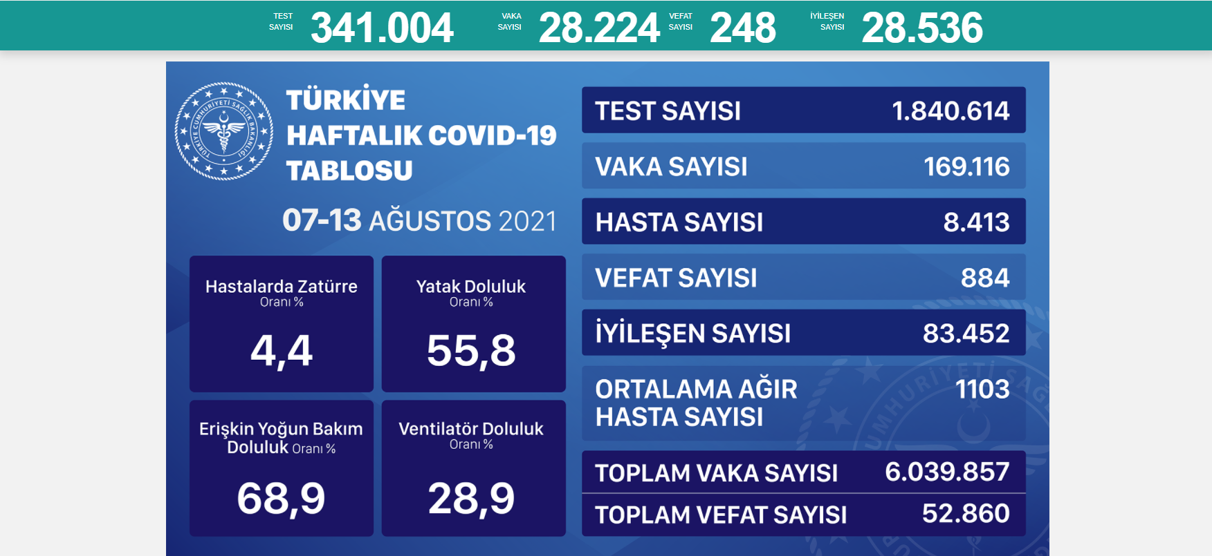 Sağlık Bakanlığı, Türkiye Günlük Koronavirüs Tablosu’nun güncel verilerini paylaştı. Bakanlığın paylaştığı verilere göre, son 24 saatte 341 bin 004 kişiye Covid-19 testi yapıldı, 28 bin 224 kişinin testi pozitif çıktı, 248 kişi daha hayatını kaybetti. İyileşen kişi sayısı ise 28 bin 536 oldu.