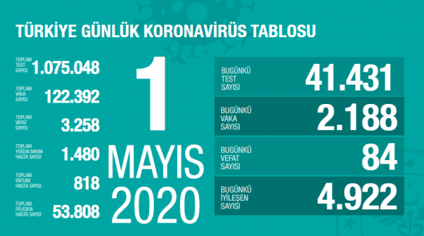 Sağlık Bakanlığı güncel koronavirüs açıklamaları kapsamında son girilen veriler ile birlikte toplam tes sayısı 1 Milyon 75 Bin 48 oldu. Toplam Vaka sayısı da 122 bin 392 olarak açıklandı. Toplam iyileşen hasta sayısında da son açıklama ile birlikte 53 bin 808 olarak duyuruldu.