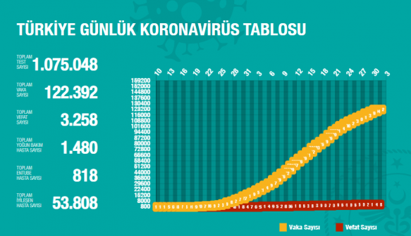 Sağlık Bakanlığı güncel koronavirüs açıklamaları kapsamında son girilen veriler ile birlikte toplam tes sayısı 1 Milyon 75 Bin 48 oldu. Toplam Vaka sayısı da 122 bin 392 olarak açıklandı. Toplam iyileşen hasta sayısında da son açıklama ile birlikte 53 bin 808 olarak duyuruldu.