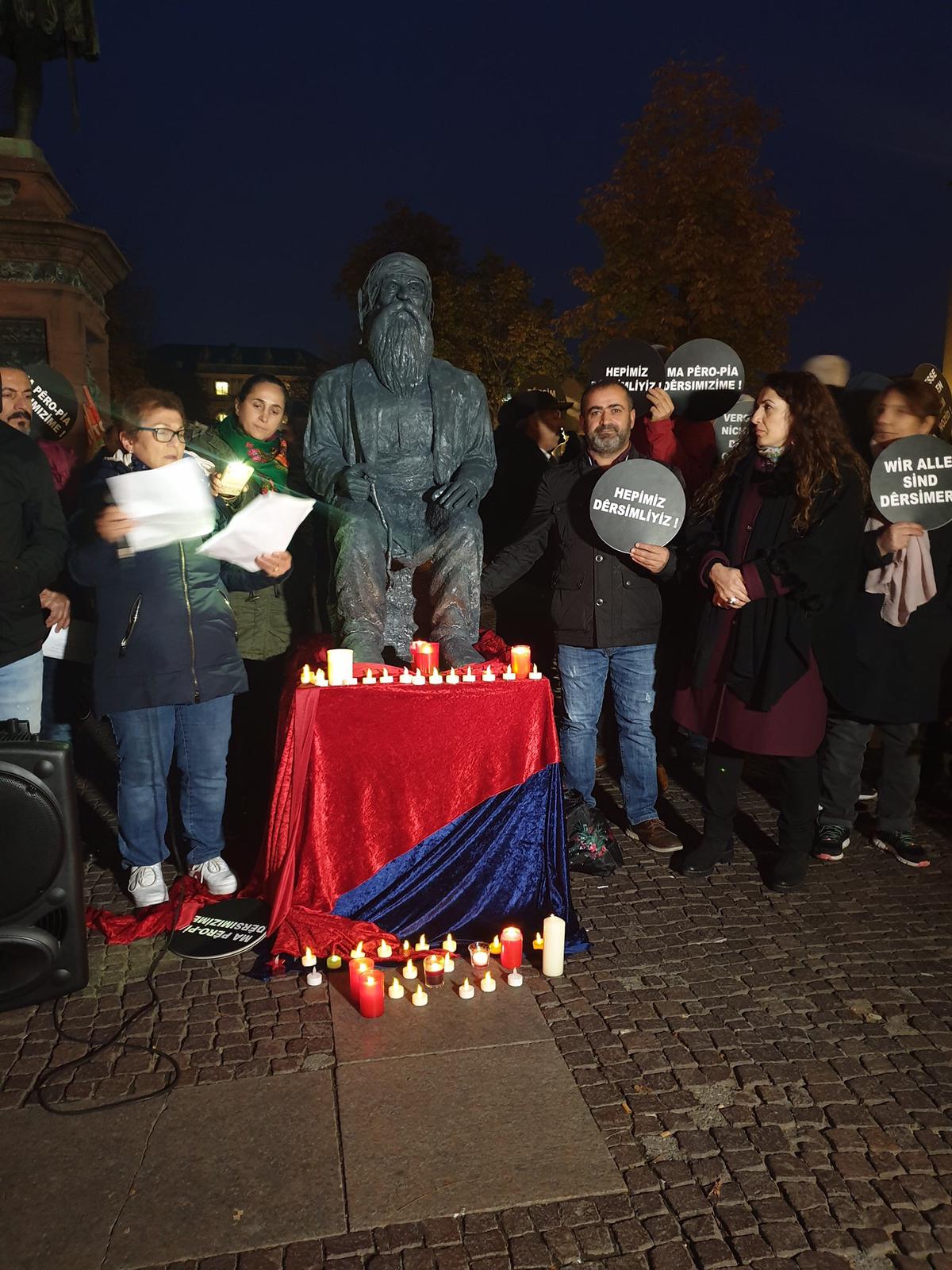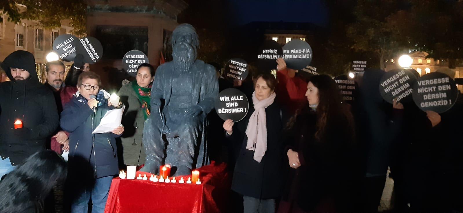 Schlossplatz’da yapılan anma okunan gulbanglar ile başladı. Heykeltraş Doğan Demir tarafından yapılan Seyid Rıza heykelinin önünde mumlar yakıldı. Daha sonra Dersim tertelesini anlatan Almanca bildiri okundu.