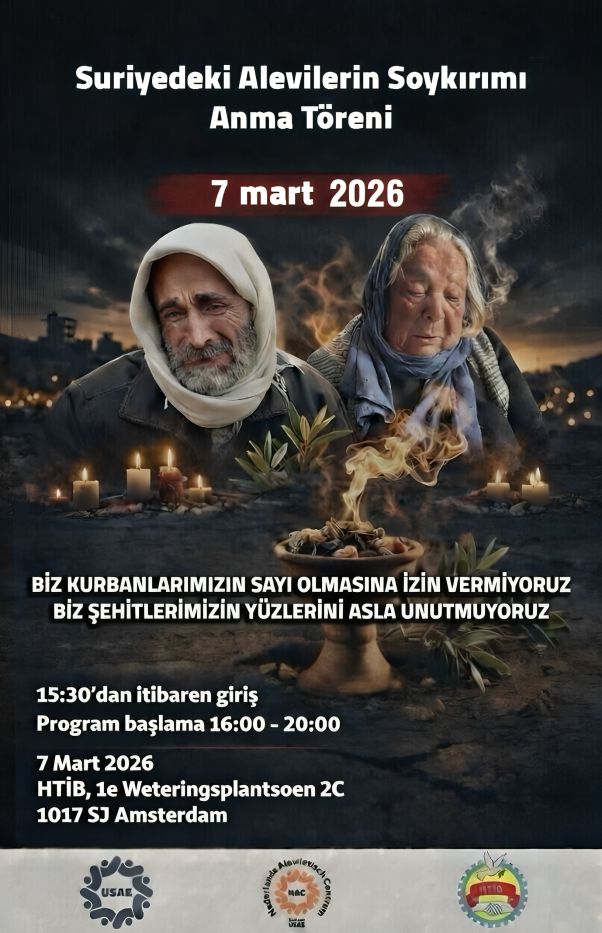 Hollanda’nın Amsterdam kentinde ise 7 Mart’ta HTİB binasında düzenlenecek anma programı saat 15.30’da başlayacak. Program 16.00–20.00 saatleri arasında gerçekleştirilecek ve Avrupa Arap Alevi Federasyonu ile Avrupa’daki Suriyeli Aleviler Derneği başta olmak üzere çok sayıda kurumun katılımıyla panel ve anma etkinliği yapılacak.