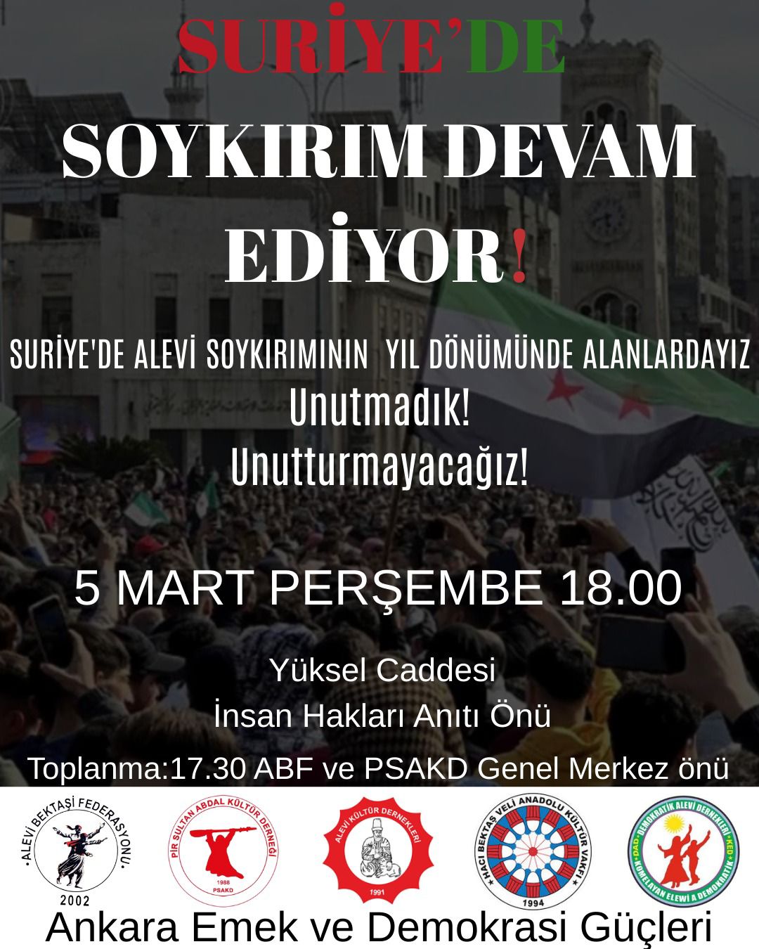 Alevi kurumları ve demokratik kitle örgütleri, 7 Mart’ta katliamın birinci yılında dünyanın birçok kentinde alanlara çıkarak hem katledilenleri anacak hem de Suriye’de Alevilere yönelik saldırıların durdurulması çağrısında bulunacak.