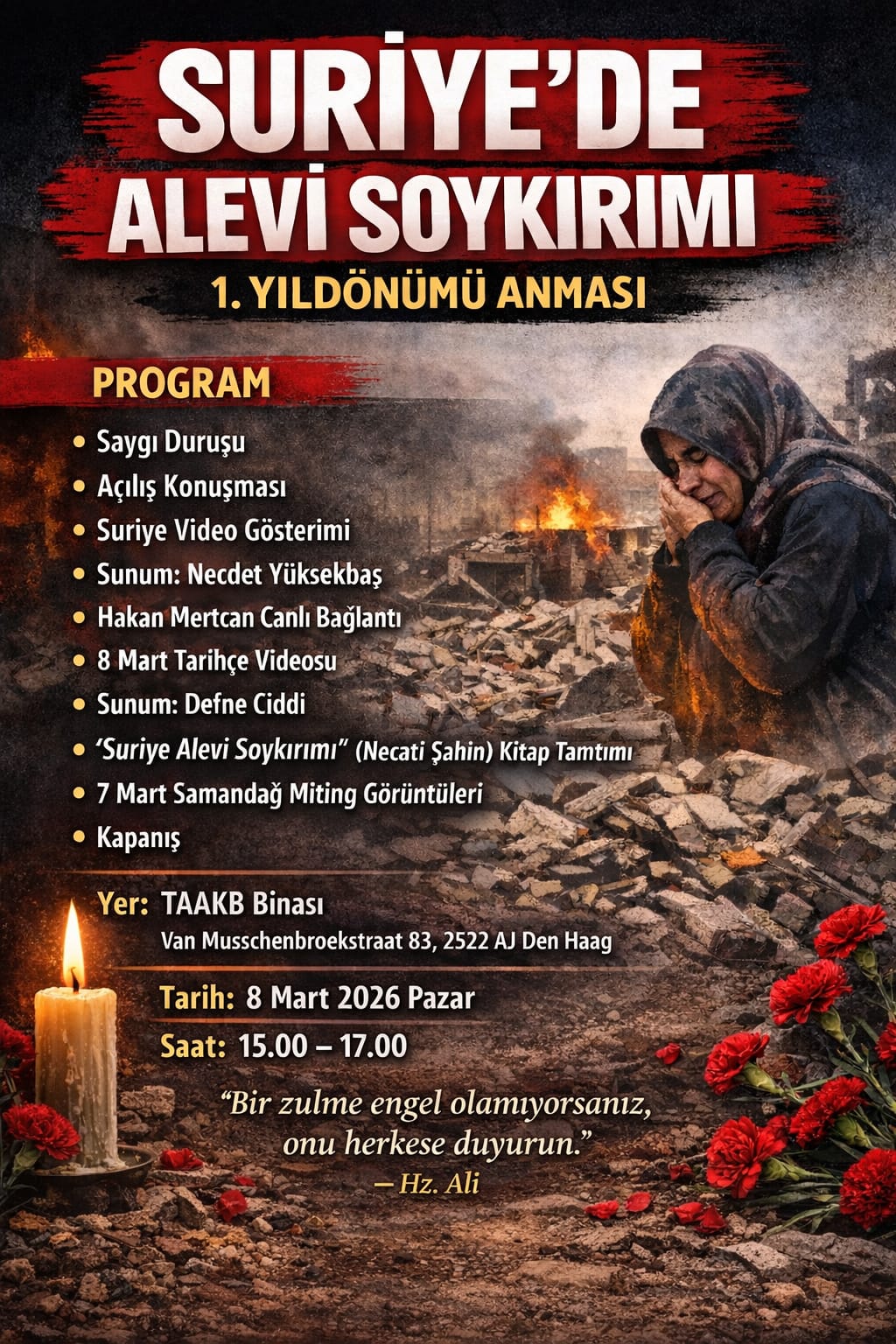 Hollanda’nın Den Haag kentinde 8 Mart’ta yapılacak anma programı TAAKB binasında gerçekleştirilecek. Saat 15.00 ile 17.00 arasında yapılacak etkinlikte saygı duruşu, konuşmalar, Suriye’deki katliama ilişkin video gösterimleri ve değerlendirmeler yer alacak.