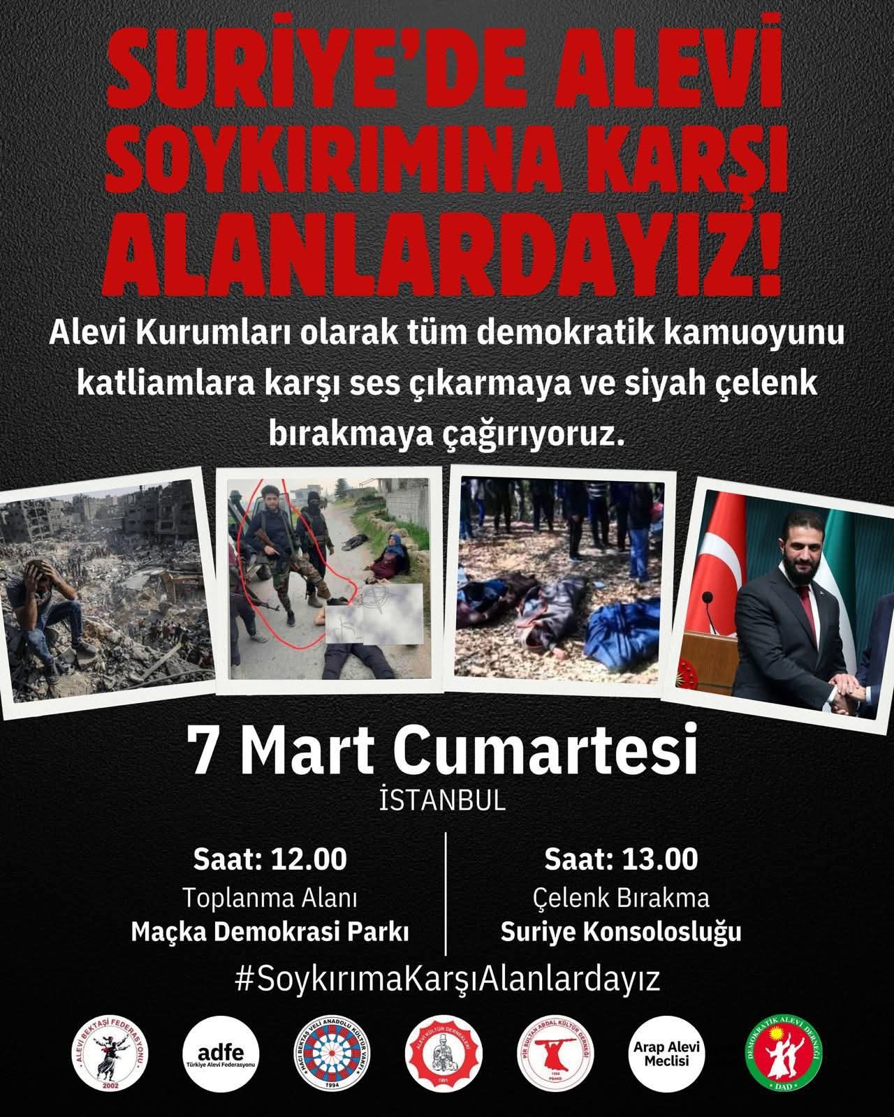 İstanbul’da 7 Mart Cumartesi günü saat 12.00’de Maçka Demokrasi Parkı’nda toplanılacak. Saat 13.00’te ise Suriye Konsolosluğu önünde siyah çelenk bırakılarak katliam protesto edilecek.