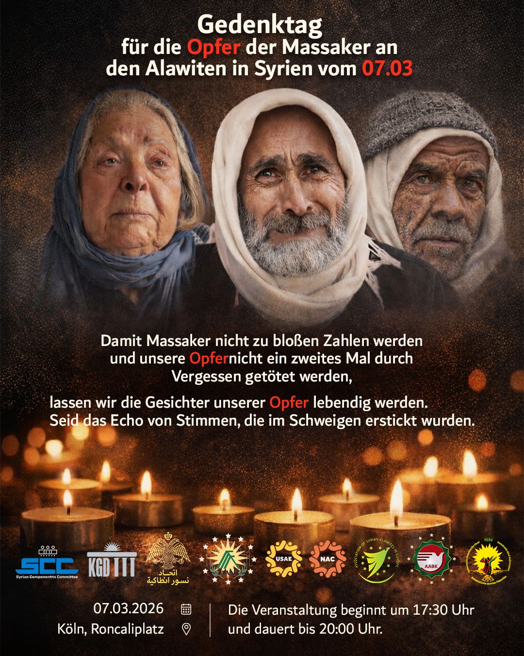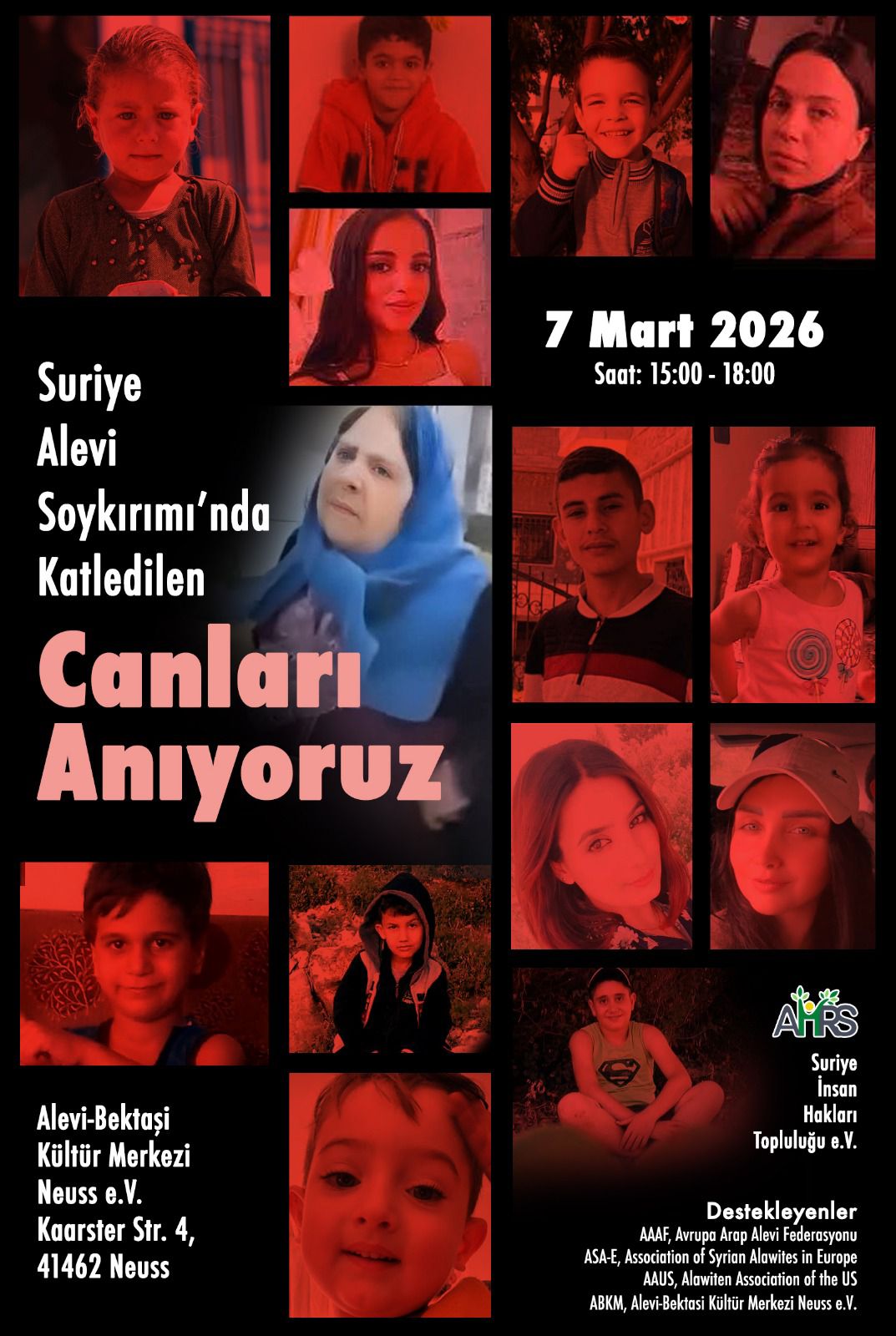 Almanya’nın Neuss kentinde Alevi-Bektaşi Kültür Merkezi’nde yapılacak anma etkinliği 7 Mart günü 15.00 ile 18.00 saatleri arasında gerçekleştirilecek. Etkinlik Suriye İnsan Hakları Topluluğu (AİRS) ve Alevi kurumlarının katılımıyla düzenlenecek.