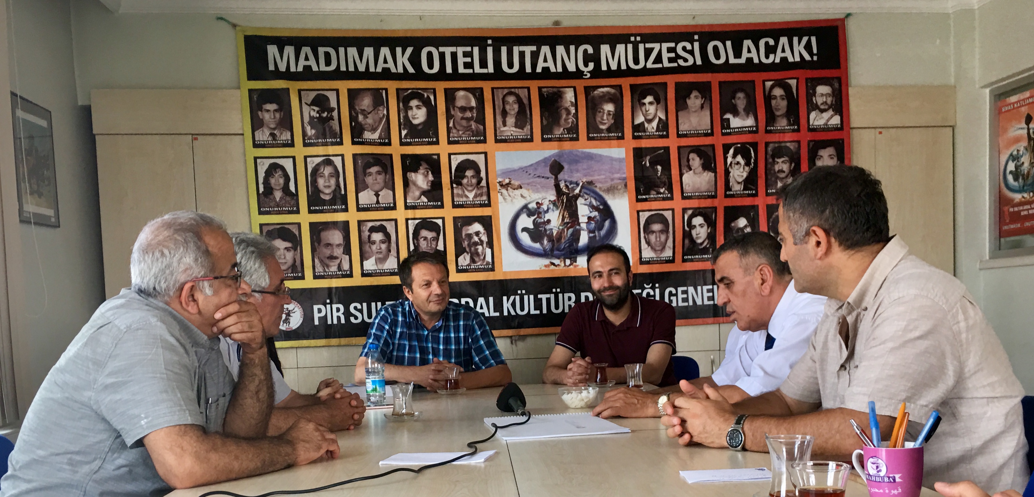 PİRHA – Suruç Katliamı’nda yaşamını yitirenlerin aileleri, Pir Sultan Abdal Kültür Derneği Genel Merkezi’ne ziyaret gerçekleştirdiler. PSAKD Genel Başkanı Gani Kaplan ve genel sekreteri Onur Şahin’in bulunduğu ziyarette düşünceler paylaşıldı.