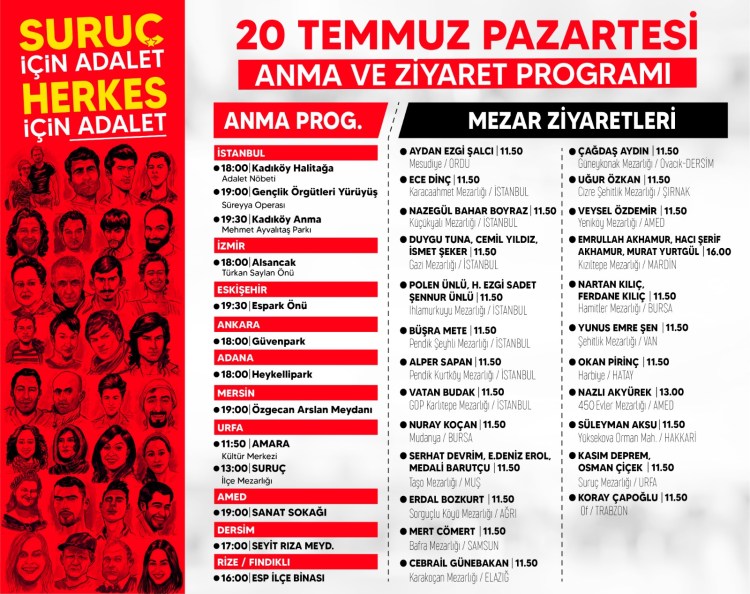 PİRHA- 33 Sosyalist gencin IŞİD’in terör saldırısı sonucu yaşamını yitirdiği Suruç Katliamı 5. yılında lanetleniyor. İstanbul, Ankara ve Urfa olmak üzere birçok kentte anmalar düzenlenecek, katliamda yaşamını yitirenlerin mezarları ziyaret edilecek.