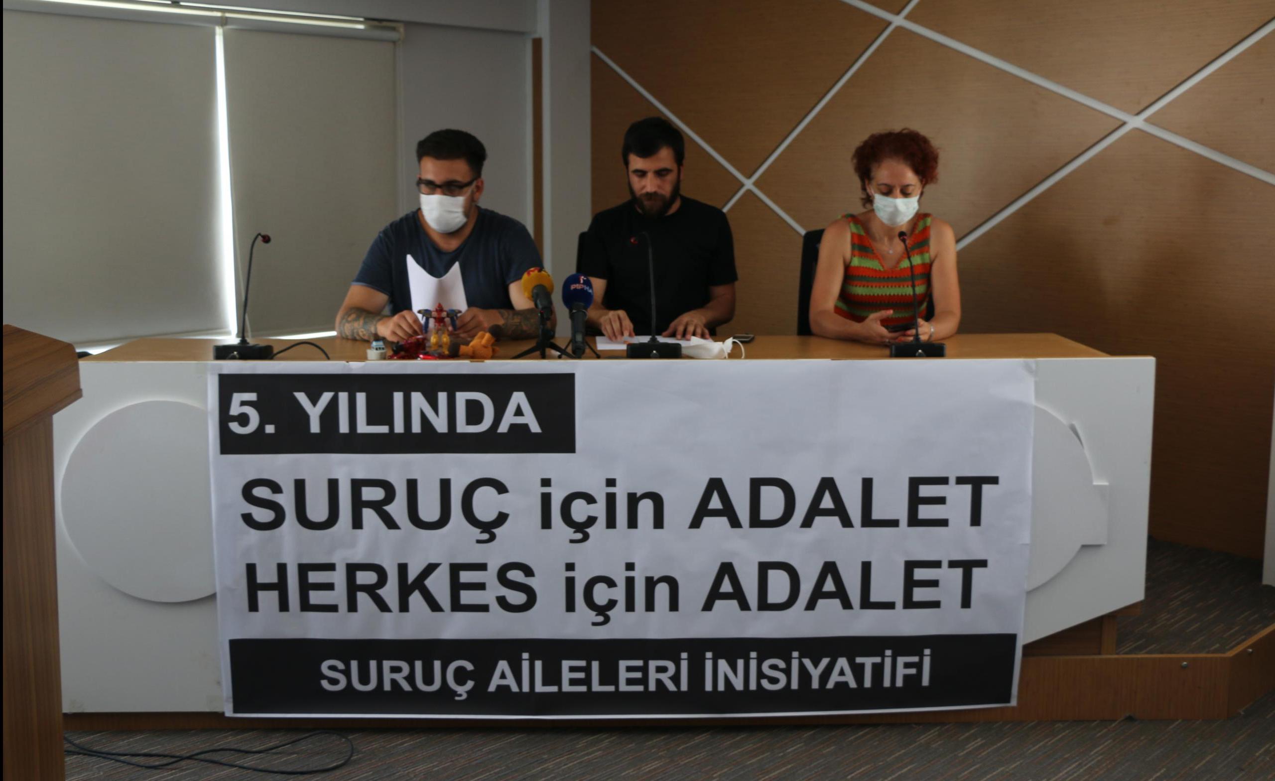 Suruç Aileleri İnisiyatifi, Sağlık ve Sosyal Hizmet Emekçileri Sendikası (SES) Genel Merkezi’nde Suruç katliamının 5. yılı dolayısıyla bir açıklama yaparak “Adalet kürsüsü” kurdu.
