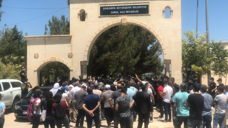Polislerle mezarlık önü kapatılarak ailelerin, Suruç’ta yaralananların, ESP Eş Başkanı Şahin Tümüklü, ESP Eş Genel Başkan Yardımcısı Beycan Taşkıran, SGDF yöneticileri ve HDP milletvekillerin bulunduğu grubun mezarlığa girmesi engellendi.