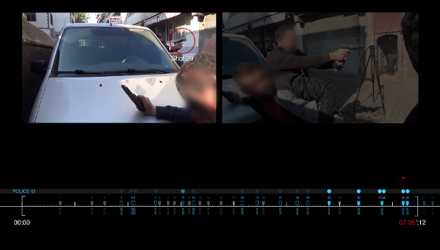 Dört eşzamanlı hale getirilen video kaydının ses ve görüntü kanallarını analiz ederek araştırmamıza konu olan zaman aralığı içinde duyulan ve görülen tüm silah atışları sayıldı ve kayda geçirildi. Böylece hangi atışların olay yerinde bulunan hangi bireyler tarafından yapıldığını tespit etmek ve işaretlememiz mümkün oldu.