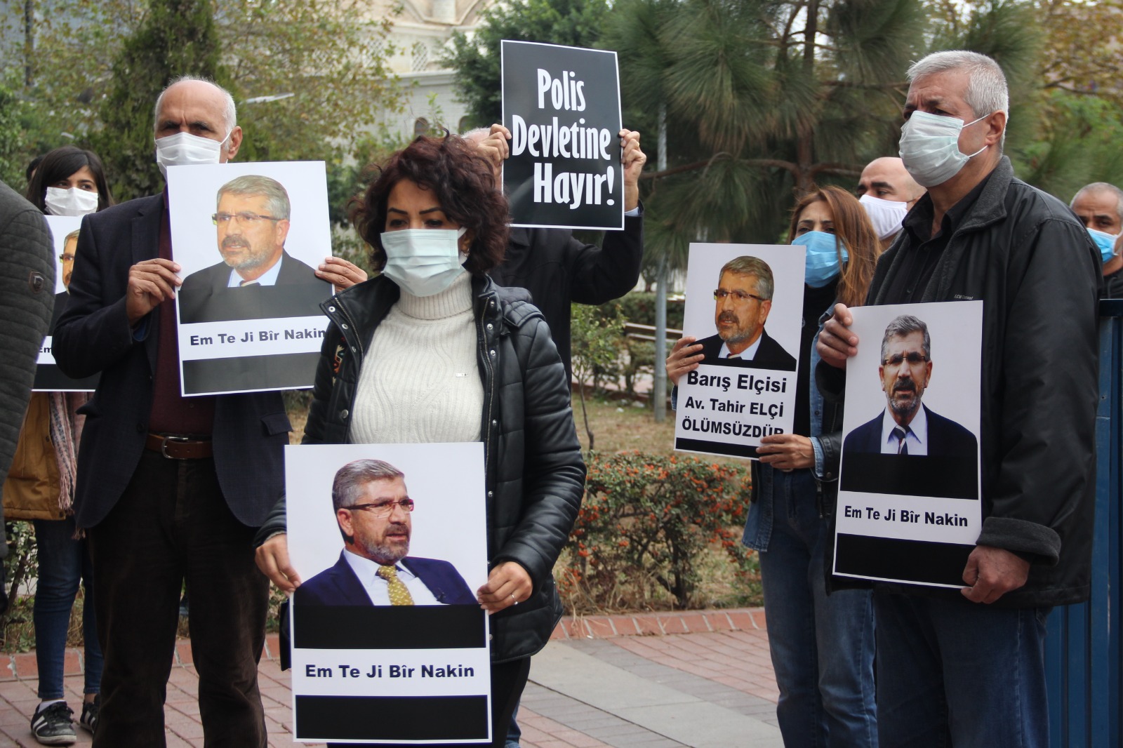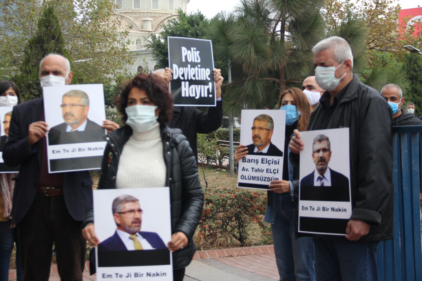 Açıklamayı okuyan ÖHD Mersin Şubesi Eşbaşkanı Hoşyar Sarıyıldız, Tahir Elçi’nin öldürülmesinden 1,5 ay önce bir televizyon programında yaptığı konuşmanın ardından hedef gösterilmeye başlandığını ve ardından katledildiğini belirterek “26 Kasım 2015 günü, Diyarbakır’ın Sur ilçesindeki tarihi Dört Ayaklı Minare yaşanan bir çatışmada zarar gördü. Tahir Elçi, 28 Kasım 2015 günü Diyarbakır Barosu adına meslektaşlarıyla birlikte bir basın açıklaması yapmak için Dört Ayaklı Minare önüne geldi. Yaptığı açıklamada Tahir Elçi ısrarla süregiden şiddetin sona ermesi çağrısında bulundu” diye konuştu.