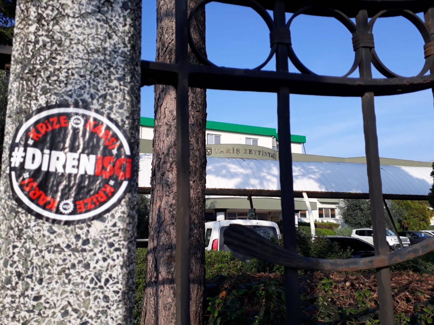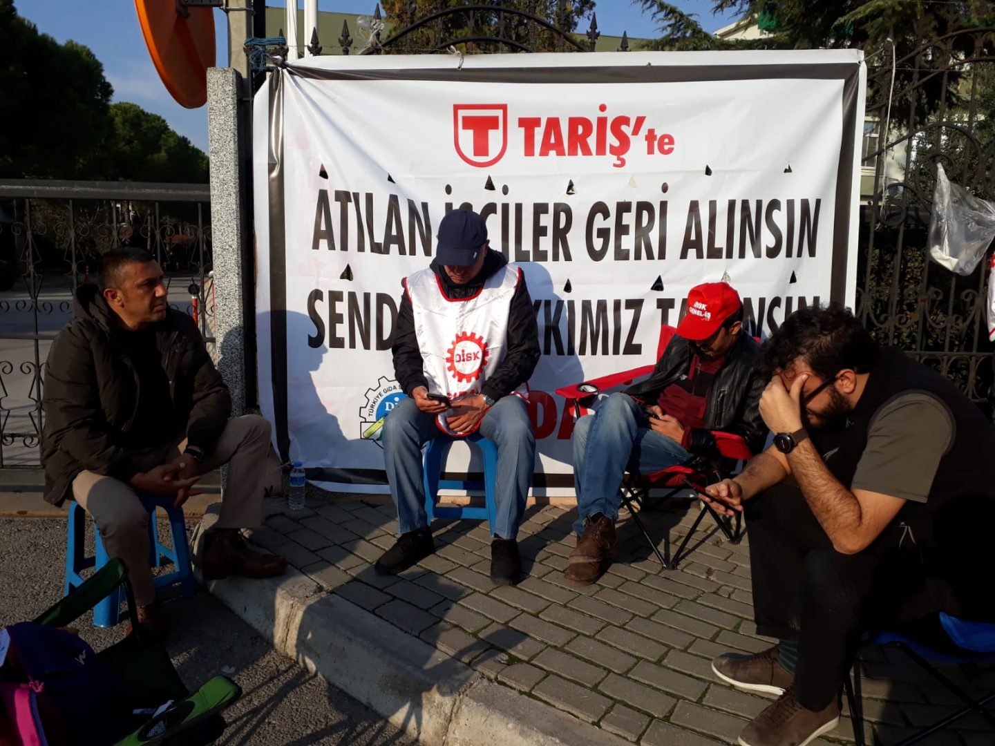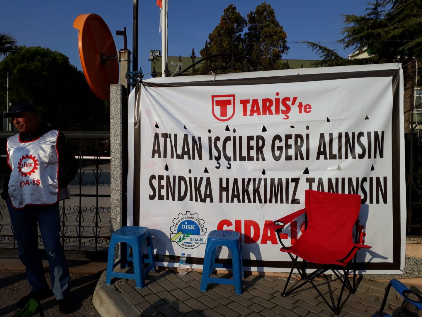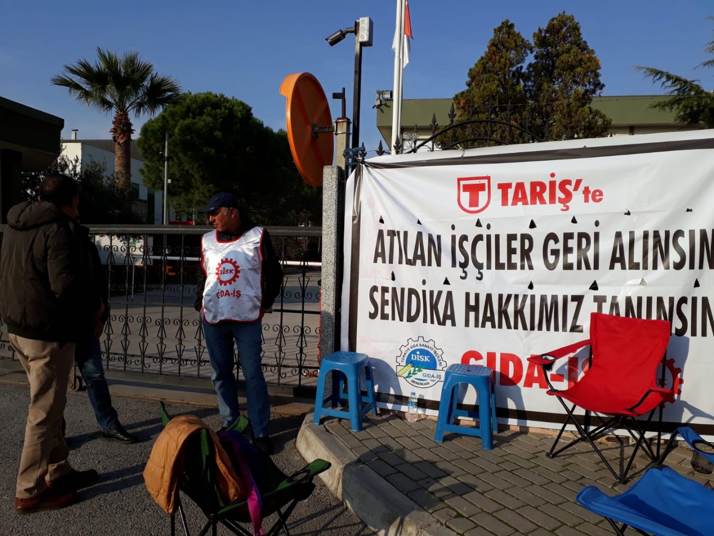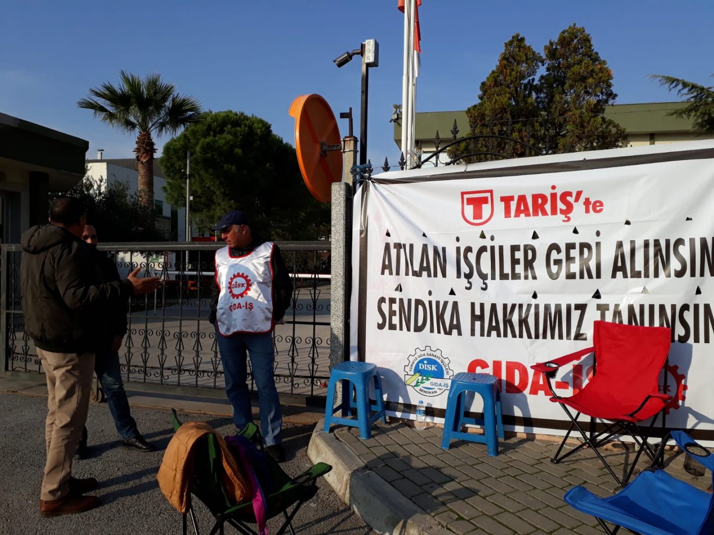 İzmir Çiğli Organize Sanayi’de bulunan TARİŞ Zeytin ve Zeytinyağı Fabrikası’nda DİSK/Gıda-İş Sendikası’na üye oldukları için işten atılan 7 işçinin fabrika önünde başlattıkları direniş 28. gününde devam ediyor. Fabrika önünde açtıkları ‘Atılan işçiler geri alınsın, sendika hakkımız tanınsın’ pankartının önünde her sabah saat 06.00’da oturmaya başlıyorlar. İşçilerden önce gelip onlar çıktıktan sonra evlerine giden direnişçi işçiler hakları verilinceye kadar oturma eylemine devam edeceklerini söylüyor.
