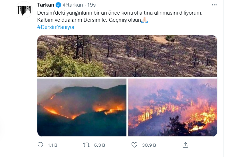 Sanatçı Tarkan’da Dersim’deki orman yangınlarına duyarsız kalmadı. Sosyal medya hesabından mesaj paylaşan sanatçı, “Dersim’deki yangınların bir an önce kontrol altına alınmasını diliyorum. Kalbim ve dualarım Dersim’le. Geçmiş olsun” ifadelerine yer verdi.