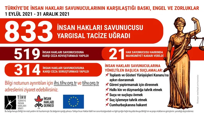 İnsan hakları savunucularının haklarında açılan temelsiz ceza soruşturma ve kovuşturmalar, hukuka aykırı ve keyfi gözaltı ve tutukluluk işlemleri ve sivil toplum kurumlarına yapılan baskın ve aramalarla yargısal tacize uğradığı belirtilen verilerde, “İnsan hakları savunucularına yönelik uygulanan bu ceza hukuku tedbirlerinin caydırıcı etkisi, savunuculuk iklimini bütünüyle baskı altına almakta ve sivil alanı daraltmaktadır” denildi. 1 Eylül – 31 Aralık 2021 tarihleri arasında 833 insan hakları savunucusuna yargısal taciz uygulandı. 519 insan hakları savunucusuna karşı ceza kovuşturması yapılmıştır. 21 kişi hakkında mahkumiyet hükmü verilerek hapis cezasına veya adli para cezasına çarptırıldı.