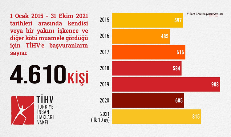 Tabloya göre; 2020’de 605 başvurunun yapıldığı görülürken 2021’in ilk 10 ayında bu sayı 815’e çıktı. TİHV’in sosyal medya hesabında yaptığı açıklama şu şekilde:
