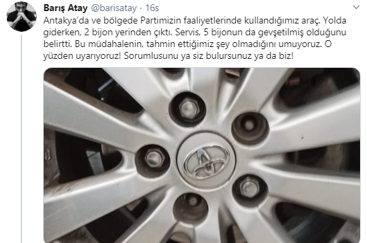 “Genel Başkan Yardımcımız Barış Atay Mengüllüoğlu’nun ve Hatay İl Örgütümüzün kullandığı araca, lastik bijonları gevşetilerek sabotaj düzenlendiği anlaşılmıştır. Aracı kullanan yoldaşımız bir kaza yaşanmadan durumu fark etmiştir ve kendisinin sağlık durumu iyidir. Konuyla ilgilenen valilik, emniyet görevlileri ve teknik ön incelemesinde araca kasıtlı olarak müdahale edildiği ve aracın takla atması hedeflendiği belirtilmiştir. Yoldaşlarımızın canına kasteden bu alçakça saldırının failleri bilsinler ki hiçbir gün Türkiye İşçi Partisi’ni yolundan döndürmez. Türkiye İşçi Partisi hiçbir karanlık odağın gözdağına boyun eğmez. Failler bulunana ve gerekli cezayı alana kadar konunun takipçisi olacağız.” (HABER MERKEZİ)