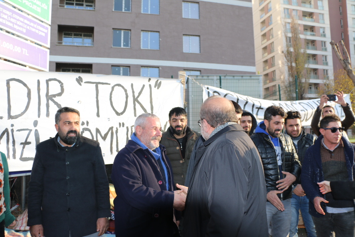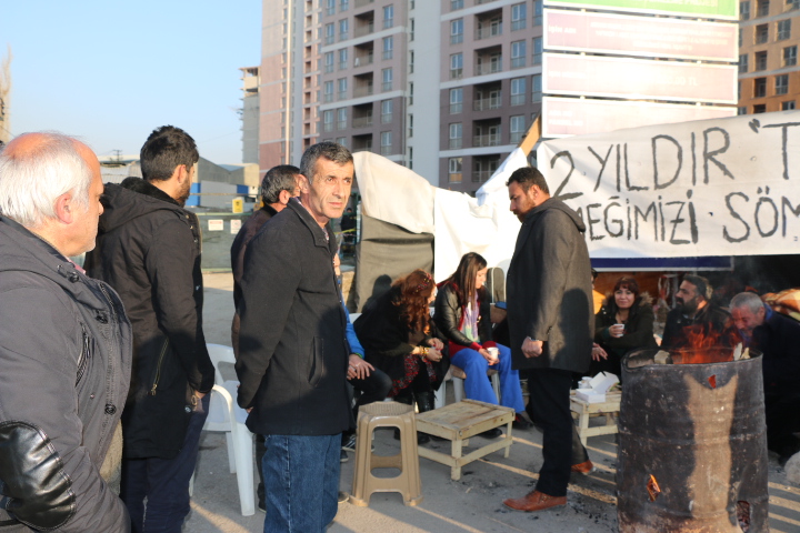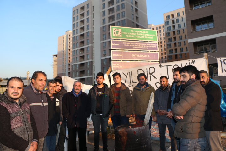 “TOKİ bize ödeme sözü verip ‘Siz de işi bitireceksiniz’ dedi. Biz de tamam dedik. Bu 2017 Aralık sonuna kadar bir hak edişimiz oldu. Biz Ocak ve Şubat ayında çalıştık. Hak edişimiz çıktı TOKİ’ye gittik hak edişimiz oldu. Ocak’ta bize verilen hak edişin ödenmesi lazımken TOKİ başkan yardımcısı bizi çağırdı ‘Evet siz hak edişi yaptınız fakat ama daha önce sizin çalıştığınız firma tarafından burada fazla çekilen bir para var ve bu para da ona sayıldı’ dedi. Biz de ‘Bizi bu işe başlatırken bize böyle bir şey söylemediniz’ dedik. Ne dediysek de ‘Benim yetkim 4 metre kare alan, benim yetkim buna yetiyor’ dedi ve ‘Bu 4 metre karenin dışına çıkamam’ dedi. 3 ay burada yattık ramazanımızı da burada geçirdik. Çoluğumuz çocuğumuza gidemedik gidecek durumumuz yoktu. Sonra tekrar TOKİ geldi barış yemeği adı altında kurban kesildi. Bize dediler ki ‘Bugüne kadar ne olduysa ne yapıldıysa bir kenara koyuyoruz bir kısım alacağınızdan vazgeçiyorsunuz, biz ne kadar alacağınız varsa onu üstleniyoruz siz işi bitireceksiniz biz de bu ödemeyi size yapacağız.’ Oturduk anlaştık devam ettik. Biz geldik çalıştık hak edişi yaptık bize dediler ki ‘5 Eylül ile 15 Eylül arasında sizin hak edişiniz olacak.’ Biz bu hak edişi yaptık gittik. Ha bugün ha yarın derken 25’inci hak edişi almamız gerekirken onu da daha alamamışız.”