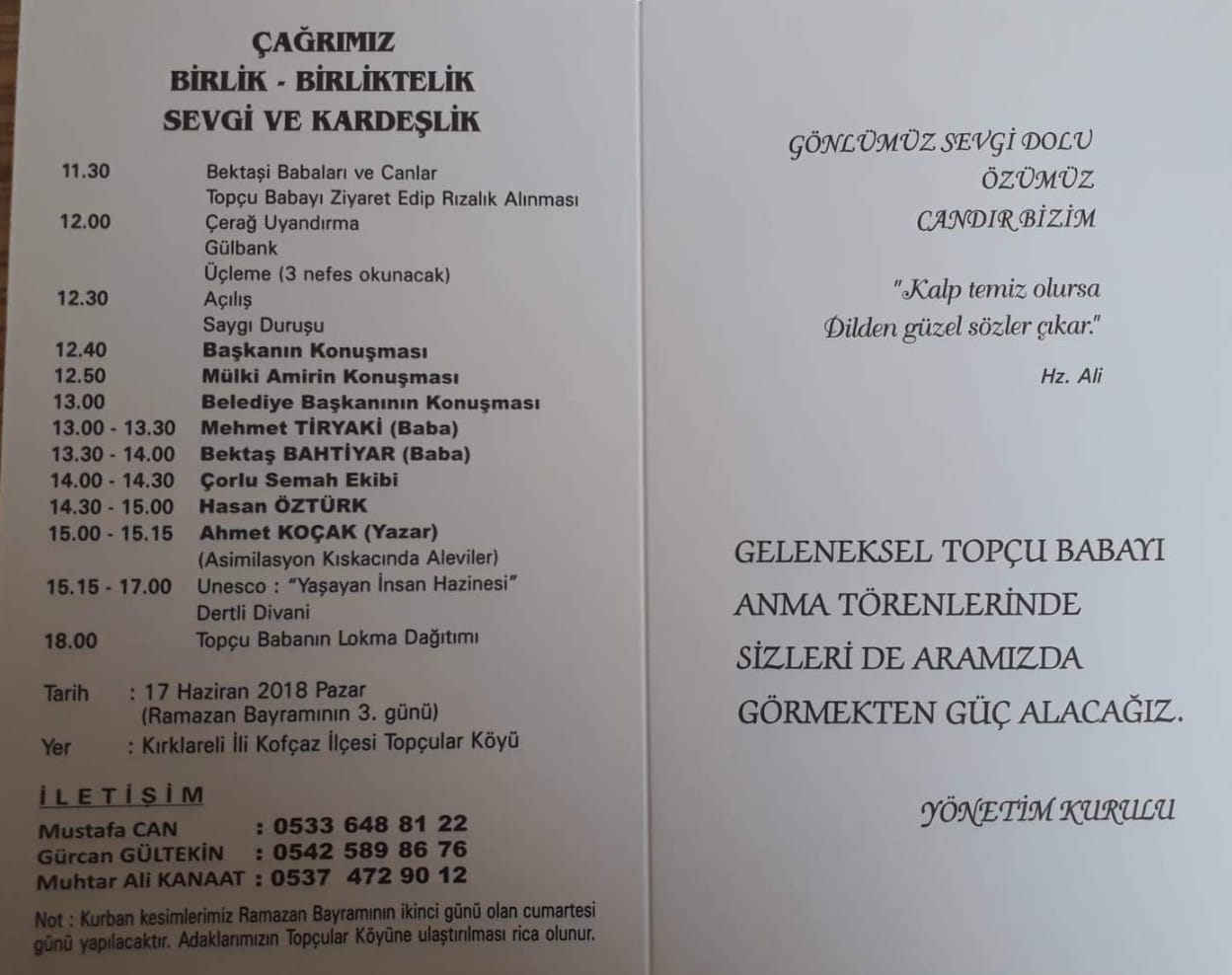Topçu Baba’yı ziyaret ederek rızalık alınmazı ile başlayacak olan etkinlik, çerağ uyandırma, gülbang, üçleme, konuşmalar, Dertli Divani dinletisi ve lokma dağıtımı ile devam edecek.