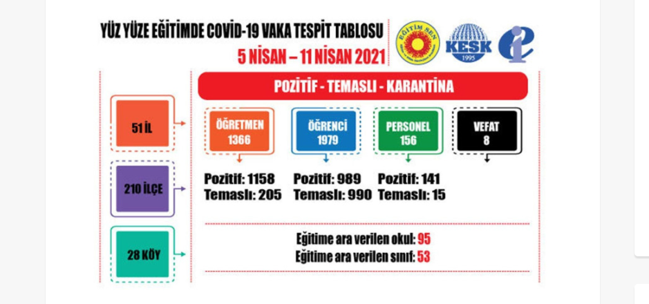 51 il, 210 ilçe ve 28 köyden derlenen verilere göre 5-11 Nisan’da 1158 öğretmen Covid-19’a yakalandı, 205 öğretmen temaslı karantinasına alındı. Covid-19 pozitif olan öğrenci sayısı 989’a çıktı, 990 öğrenci ise temaslı. Okul personelinden 141’i Covid-19’a yakalandı, 15’i temaslı karantinasında. Verilere göre geçtiğimiz hafta 8 eğitim emekçisi Covid-19’dan yaşamını yitirdi.