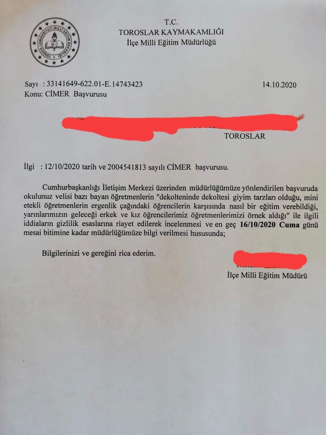 CİMER üzerinden kadın öğretmenlerin giyimi ile ilgili “dekoltenin de dekoltesi giyim tarzı olduğu, mini etekli öğretmenlerin ergenlik çağındaki öğrencilerin karşısında nasıl bir eğitim verebildiği, yarınlarımızın geleceği erkek ve kız öğrencilerimiz öğretmenlerimizi örnek aldığı” iddiaları ile yapılan şikayet hakkında Toroslar İlçe Milli Eğitim Müdürlüğü okul idaresinden bilgi vermesini istedi.