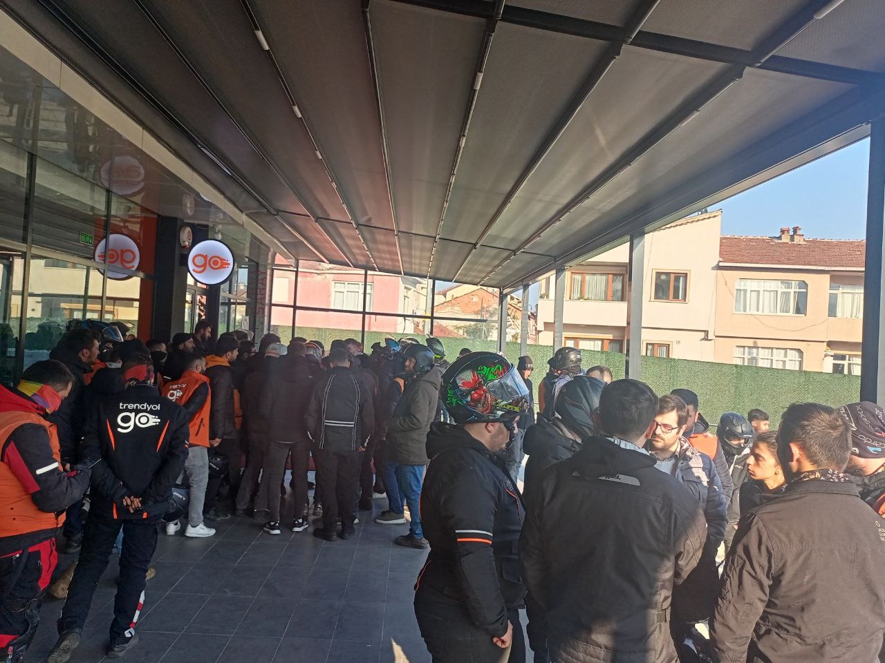 İstanbul’da Alibeyköy, Pendik, Kozyatağı gibi farklı ofislerin önünde bir araya gelen Trendyol Go kuryeleri haklarını almak için kontak kapatarak iş bıraktı.