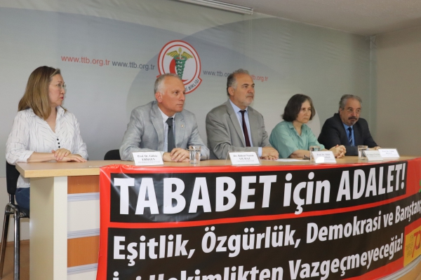 Türk Tabipleri Birliği (TTB), Genel Merkez binasında 22 Haziran’da 65 tabip odasından gelecek delegelerle gerçekleştirecekleri “Tababet İçin Adalet” temalı 70’inci Büyük Kongre gündemi ve ayrıntılarıyla ilgili basın toplantısı düzenledi. TTB Merkez Konseyi Başkanı Prof. Dr. Sinan Adıyaman, TTB Genel Sekreteri Dr. Bülent Nazım Yılmaz, TTB Merkez Konseyi üyeleri Prof. Dr. Gülriz Erişgen ve Dr. Selma Güngör ile Ankara Tabip Odası Başkanı Prof. Dr. Vedat Bulut’un katıldığı basın toplantısında, açıklamayı Sinan Adıyaman okudu.