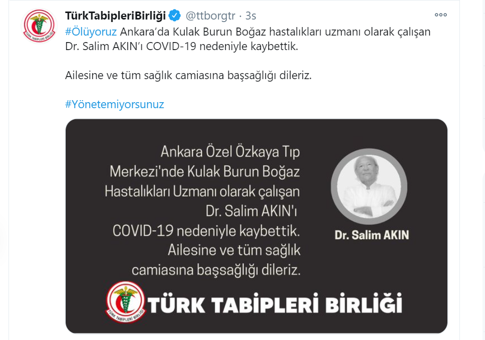 “Hükümetin salgına karşı etkili bir mücadele yürütmemesi nedeniyle sağlık çalışanları olarak tükendik! ‘Sağlık çalışanları tükendikçe karanlık çöküyor’. Bu gidişata DUR demek için 11-15 Kasım tarihleri arasında her akşam saat 21:00’de 1 dakika boyunca ışıklarımızı açıp kapatıyoruz. Sağlık çalışanları tükendikçe karanlık çöküyor. Salgın tüm yıkıcı etkisi ile devam ediyor. Her gün bir meslektaşımızı COVID-19 nedeniyle kaybediyoruz. Tükenmeden, ölmeden, emeğimizin hakkını alarak çalışabileceğimiz bir sağlık ortamı için 11 Kasım-15 Kasım tarihleri arasında her akşam 21.00’de ışıklarımızı açıp kapatıyoruz. COVID-19 meslek hastalığı kabul edilsin. #Yönetemiyorsunuz #Tükeniyoruz #Ölüyoruz”
