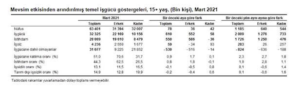 TÜİK’E göre, işgücü 2021 yılı Mart ayında bir önceki aya göre 610 bin kişi artarak 32 milyon 325 bin kişi, işgücüne katılma oranı ise 0,9 puanlık artış ile yüzde 51,0 olarak gerçekleşti.
