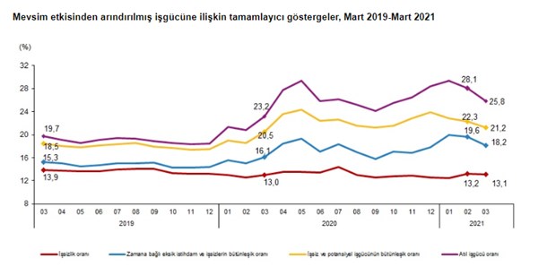 Zamana bağlı eksik istihdam, potansiyel işgücü ve işsizlerden oluşan atıl işgücü oranı 2021 yılı Mart ayında bir önceki aya göre 2,3 puan azalarak yüzde 25,8 oldu. Zamana bağlı eksik istihdam ve işsizlerin bütünleşik oranı yüzde 18,2 iken, potansiyel işgücü ve işsizlerin bütünleşik oranı yüzde 21,2 olarak gerçekleşti.