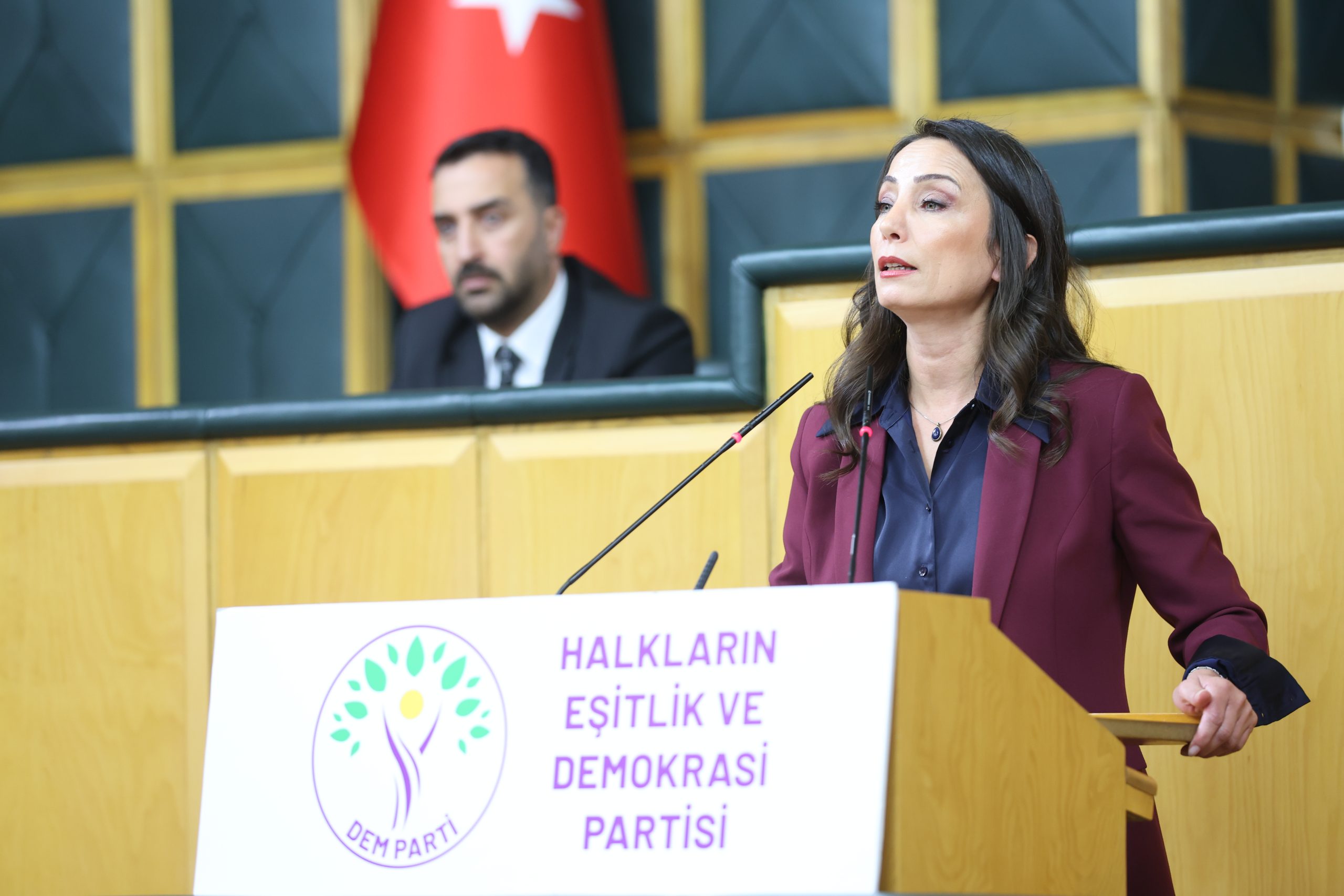 Halkların Eşitlik ve Demokrasi Partisi (DEM Parti) Eş Genel Başkanı Tülay Hatimoğulları, partisinin haftalık Meclis grup toplantısında değerlendirmelerde bulunuyor.