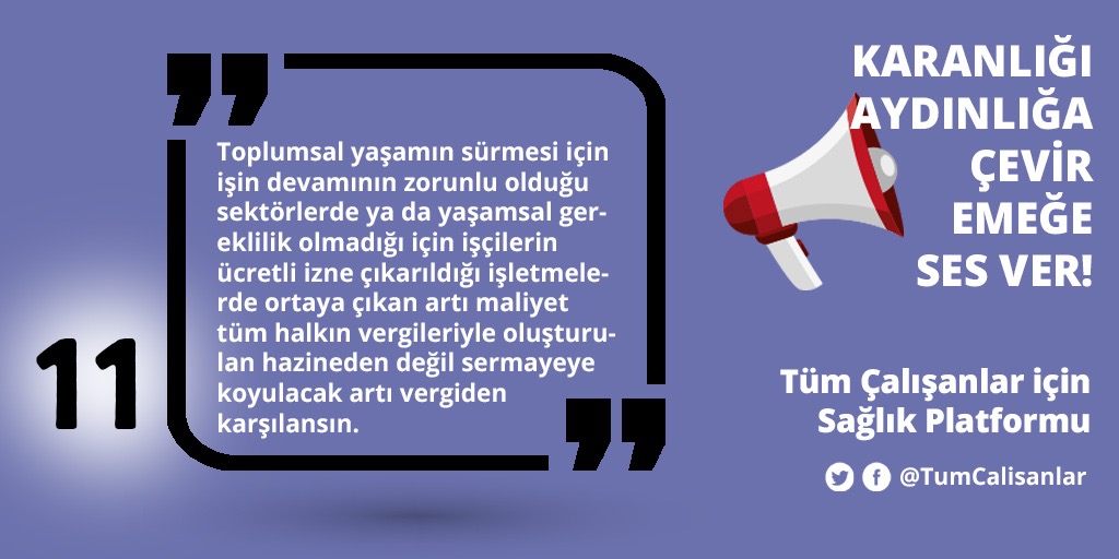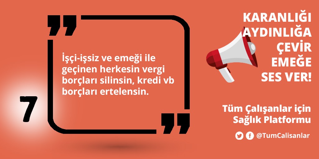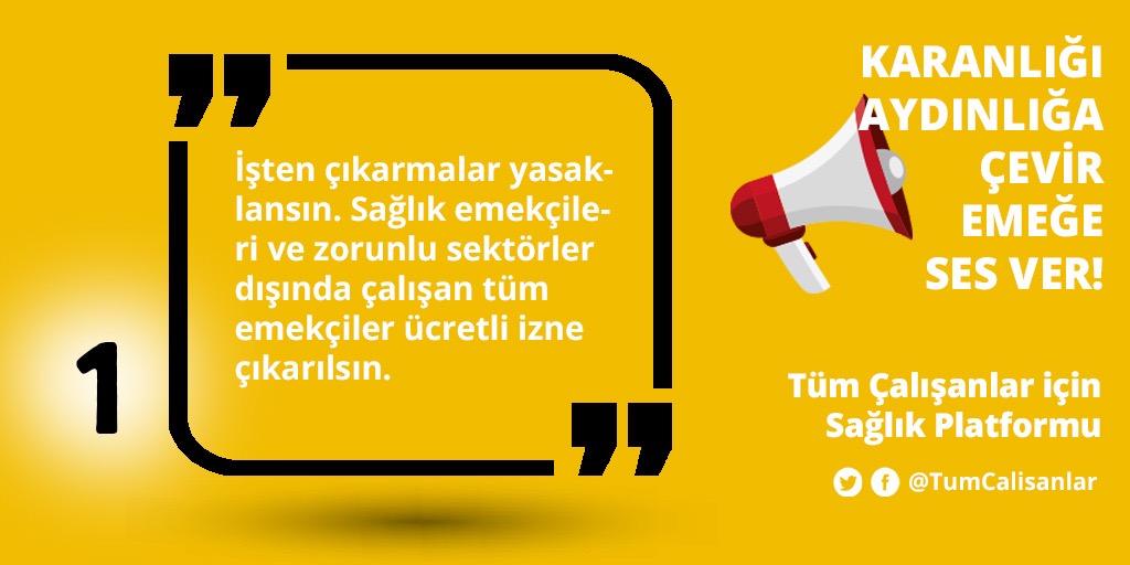 Açıklamada, “Aralık ayından bu yana tüm dünyayı etkisi altına alan, bugün Covid-19 olarak adlandırdığımız salgın ülkemizde de etkisini arttırmıştır. Tablo herkes için ama özellikle de emekçiler için yaşamsal bir tehdit boyutlarına ulaşmıştır. Ancak açıklanan tedbirlerin hiçbirinin biz işçi-emekçiler ile bir ilgisi yoktur. Adeta ölümüne çalışmak ya da ölene kadar çalışmak dayatılmaktadır. Neredeyse herkes kendi başının çaresine baksın noktasına gelinmiştir. Fakat biz diyoruz ki; emekçiler risk altında. Salgınla birlikte daha da derinleşen ekonomik krizin yükü emekçilerin sırtına yüklenemez. Artık hayati hale gelen taleplerimizi aşağıda imzası olan kurumlar olarak yüksek sesle dillendiriyoruz. Tüm toplumu 02.04.2020 (Perşembe) tarihinden itibaren her gün 20:20 saatinde bir dakika boyunca ışık yakıp söndürerek taleplere destek vermeye ve ses çıkarmaya çağırıyoruz” ifadeleri yer aldı.