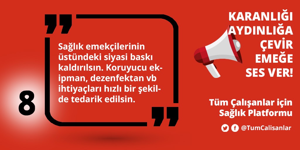 *Sağlık emekçilerinin üstündeki siyasi baskı kaldırılsın. Koruyucu ekipman, dezenfektan vb ihtiyaçları hızlı bir şekilde tedarik edilsin.