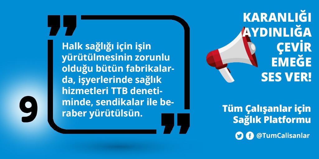 *Halk sağlığı için işin yürütülmesinin zorunlu olduğu bütün fabrikalarda, işyerlerinde sağlık hizmetleri TTB denetiminde, sendikalar ile beraber yürütülsün.