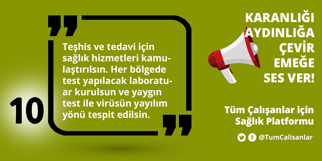 *Teşhis ve tedavi için sağlık hizmetleri kamulaştırılsın. Her bölgede test yapılacak laboratuvar kurulsun ve yaygın test ile virüsün yayılım yönü tespit edilsin.