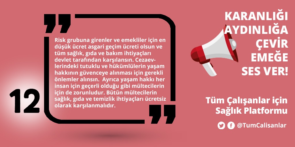 *Risk grubuna girenler ve emekliler için en düşük ücret asgari geçim ücreti olsun ve tüm sağlık, gıda ve bakım ihtiyaçları devlet tarafından karşılansın. Cezaevlerindeki tutuklu ve hükümlülerin yaşam hakkının güvenceye alınması için gerekli önlemler alınsın. Ayrıca yaşam hakkı her insan için geçerli olduğu gibi mültecilerin için de zorunludur. Bütün mültecilerin sağlık, gıda ve temizlik ihtiyaçları ücretsiz olarak karşılanmalıdır.
