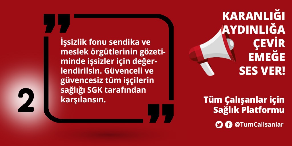 *İşsizlik fonu sendika ve meslek örgütlerinin gözetiminde işsizler için değerlendirilsin. Güvenceli ve güvencesiz tüm işçilerin sağlığı SGK tarafından karşılansın.