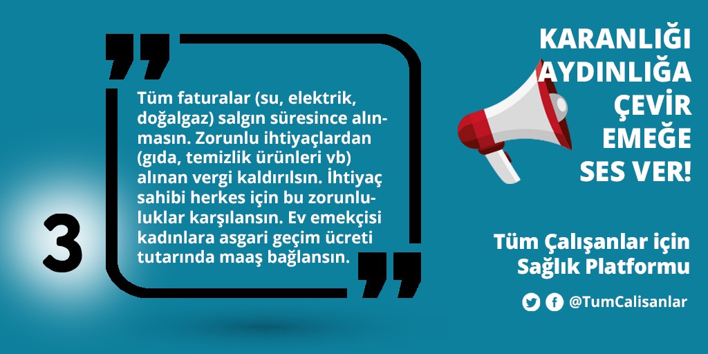 *Tüm faturalar (su, elektrik, doğalgaz) salgın süresince alınmasın. Zorunlu ihtiyaçlardan (gıda, temizlik ürünleri vb) alınan vergi kaldırılsın. İhtiyaç sahibi herkes için bu zorunluluklar karşılansın.